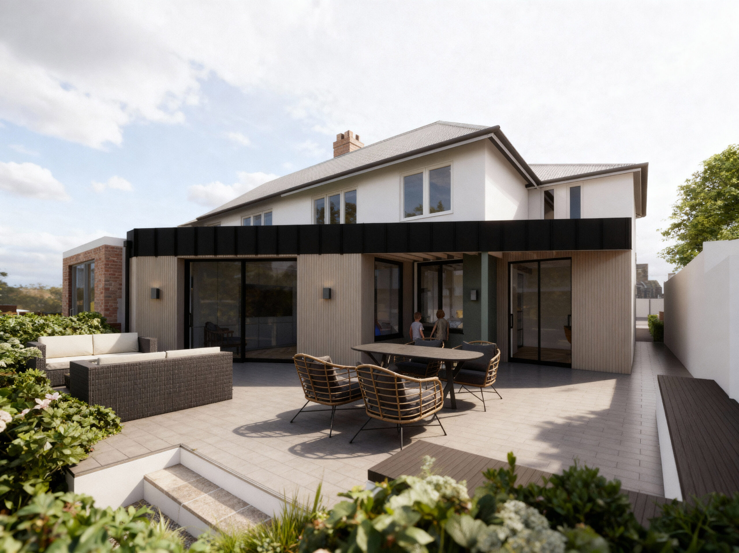 Internally, the layout has been completely reimagined to create a flow that draws you through the space. From the moment you step inside, your view is directed through the house to the expansive glazing at the rear, connecting the interior to the Beckenham landscape beyond. The open-plan kitchen, dining, and play area at the rear of the house is designed as the social heart of the home—an inviting, light-filled space where the family can gather and interact.
