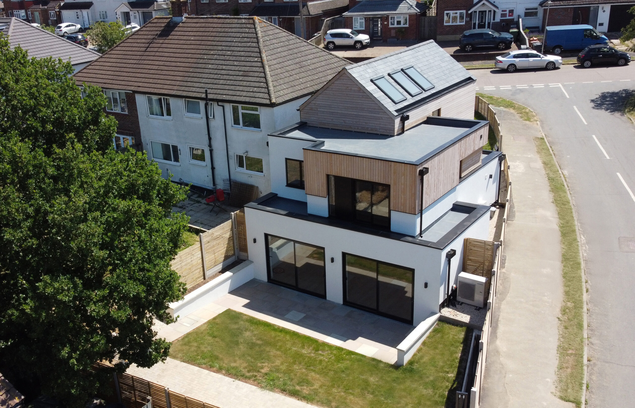 Deceptive in scale; from the front, the building has a minimal impact on the existing Hertsmere streetscape as a small single storey house with a pitched roof and loft dormer. As one moves around the curved corner of the site, the form starts to expand, stepping outwards in size and downwards in height down the sloping site; fully expressing its contemporary form at the rear.