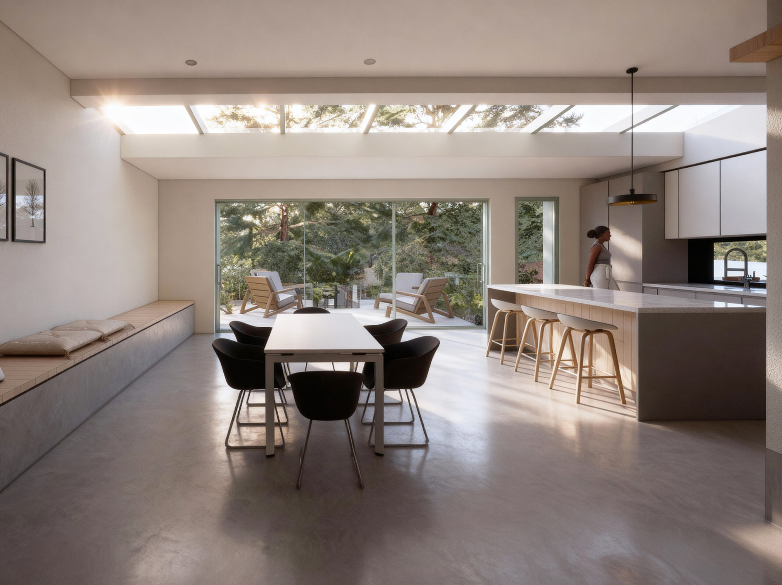 One of the most dramatic features of this South Croydon house is the full-width roof light above the living space, bathing the interior in natural light and framing treetop views. Walking through this space, you feel the design’s intent to draw the outdoors in. The result is a home that feels both dynamic and grounded, balancing thoughtful design details with a strong connection to its environment—a space that’s as practical as it is beautiful.